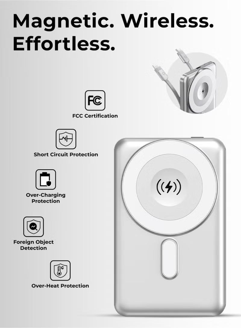 Crafted with a slim, lightweight profile and premium silver finish, it slips effortlessly into pockets or bags without adding bulk. Multi-layer safety protection guards against overcharging, overheating, and short circuits, while the LED indicator keeps you informed of remaining battery life at a glance.