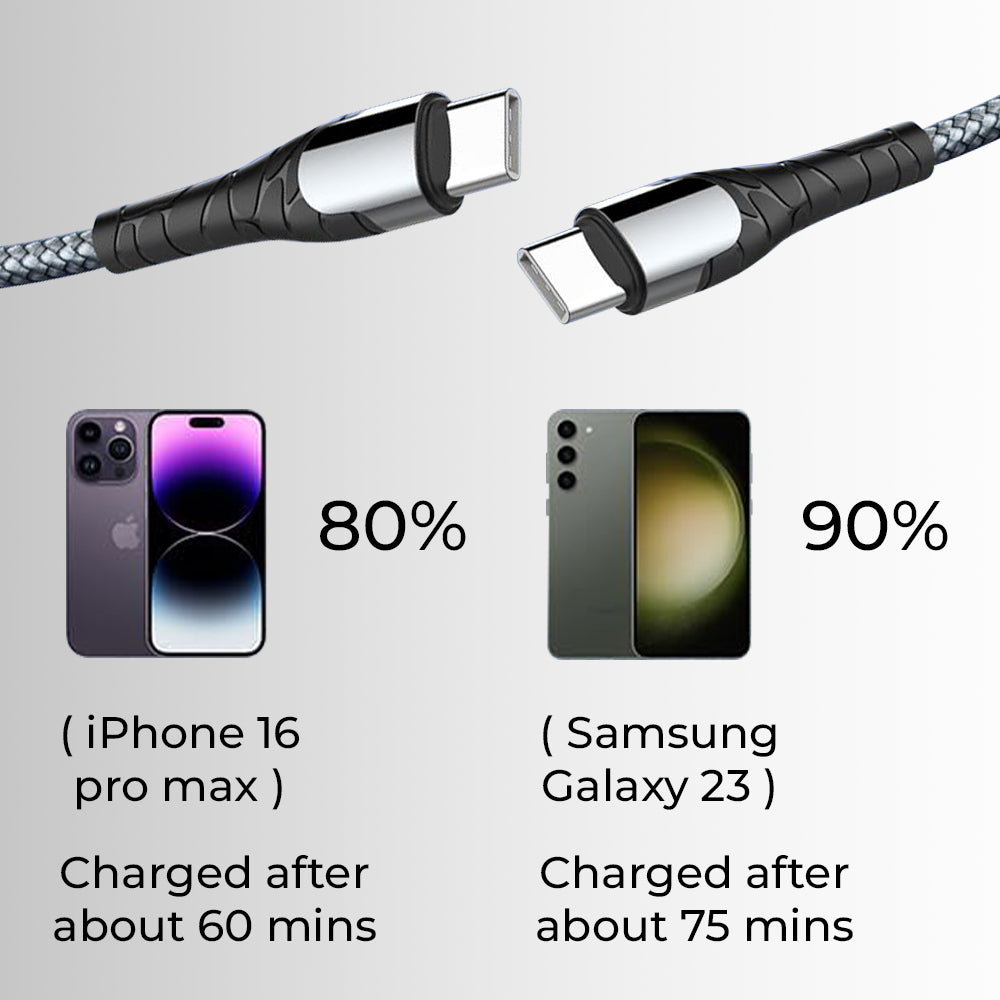 - 60W PD Fast Charge: Charge 2x faster. The USB C to USB C Cable 60W (20V 3A) output quickly charges your device to 70% in 30 minutes or fully powers a 13'' MacBook Air in 1.5 hours when paired with a 60W PD charger.