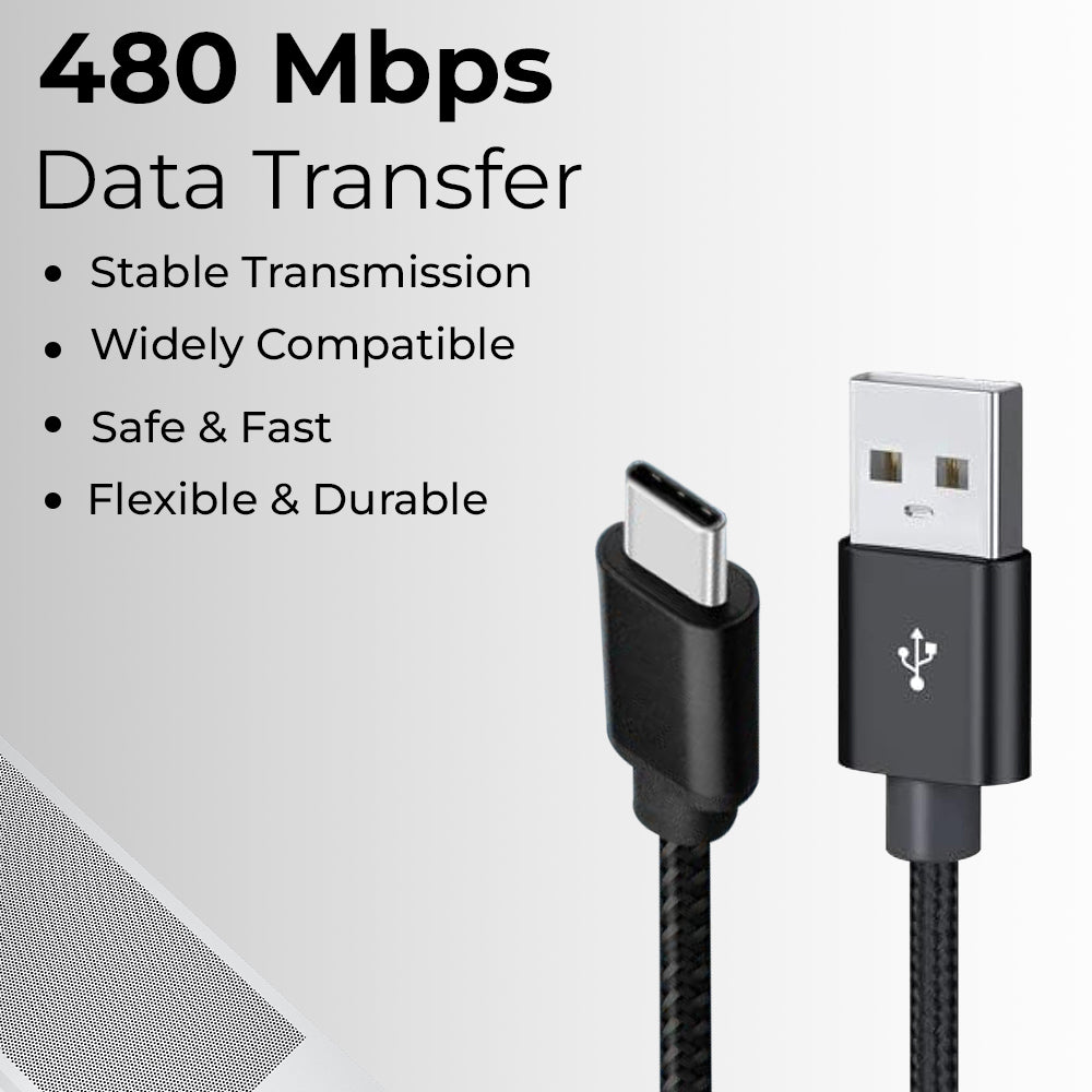 USB A to C cable 1.2 Meter 3A high current fast charging Pure Copper PVC & nylon braid 480Mbps transfer speed (Black)